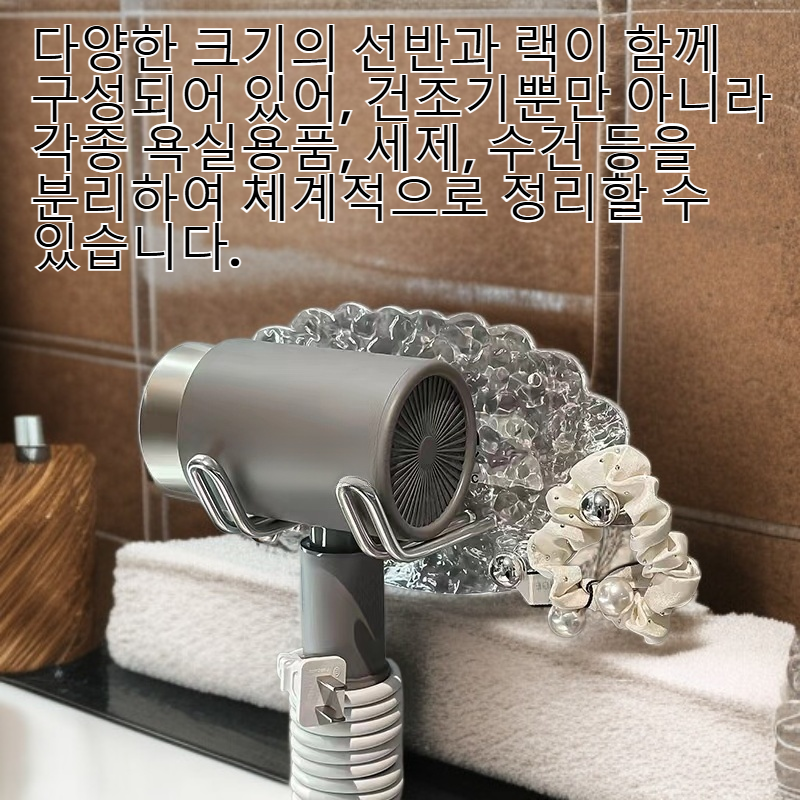 ● 다양한 크기의 선반과 랙이 함께 구성되어 있어, 건조기뿐만 아니라 각종 욕실용품, 세제, 수건 등을 분리하여 체계적으로 정리할 수 있습니다.